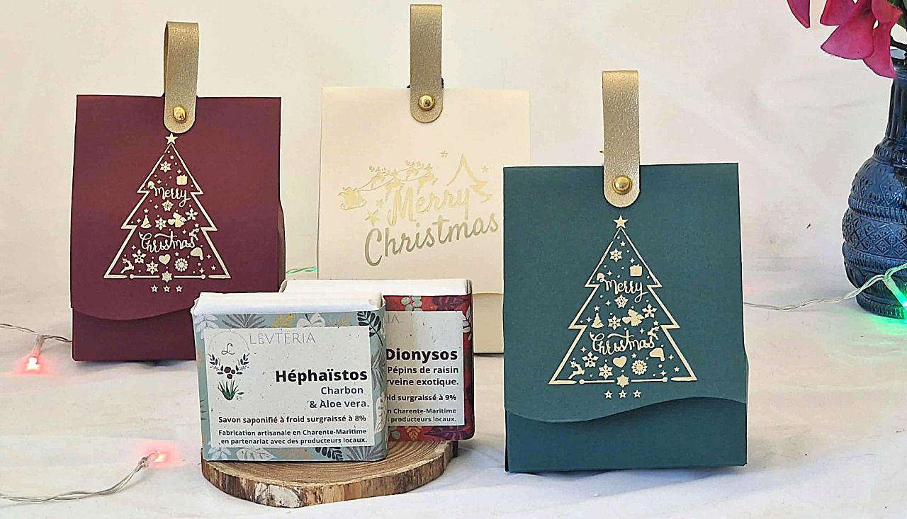Le coffret Pyramide de Noël présenté dans de jolies boites (couleur au choix) contient deux savons de 100g à sélectionner parmi ceux de notre gamme